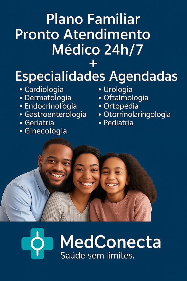 Plano Familiar (titular + 3 dependentes) com bônus para compra de remédios ou desconto em exames médicos. Sem carência.